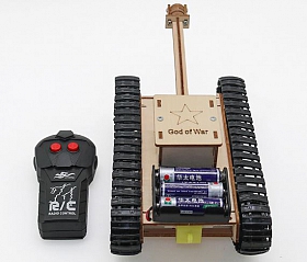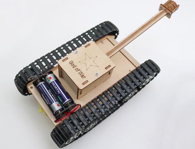 Sản phẩm bao gồm: các khối gỗ đã cắt sẵn, điều khiển từ xa và mạch nhận, động cơ giảm tốc, giá động cơ, 8 bánh xe chịu lực chuyển động, 2 bánh xích, trục, ốc vít, tovit, khay pin 2 viên có công tắc gạt..